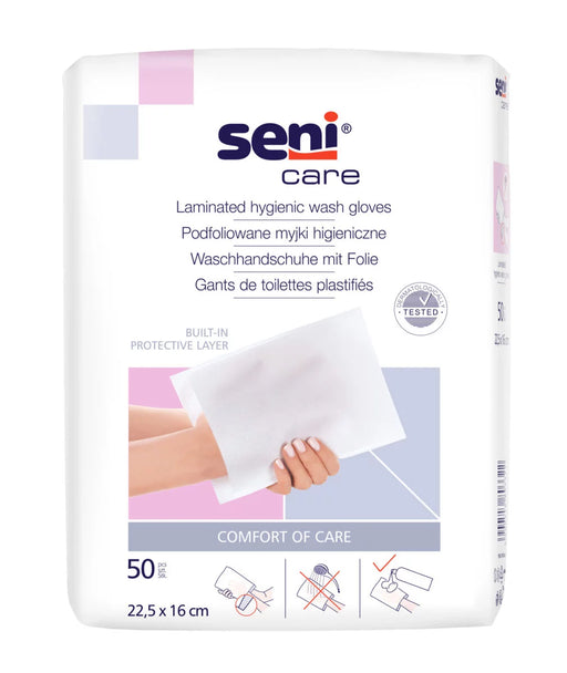 Skatīt pilnu informācijuSENI CARE mazgāšanas cimdi ar plēvi, 50 gab.